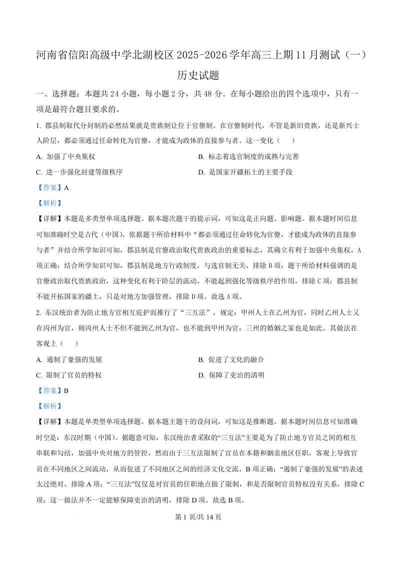 河南省信阳高级中学北湖校区2025-2026学年高三上期11月测试(一)历史答案.docx