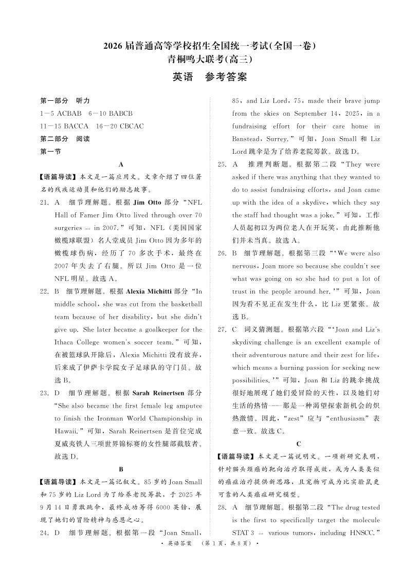青桐鸣大联考2025-2026学年高三上学期11月联考 英语(全国一卷)答案.pdf