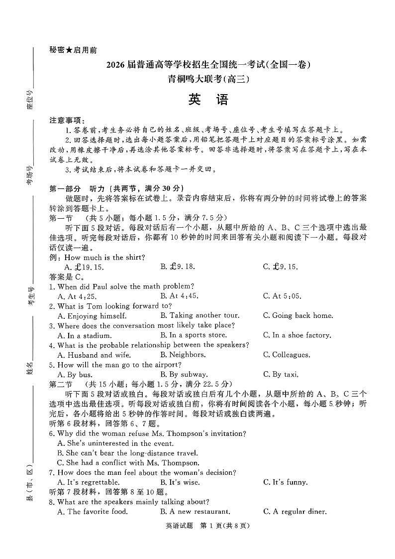 青桐鸣大联考2025-2026学年高三上学期11月联考 英语(全国一卷).pdf