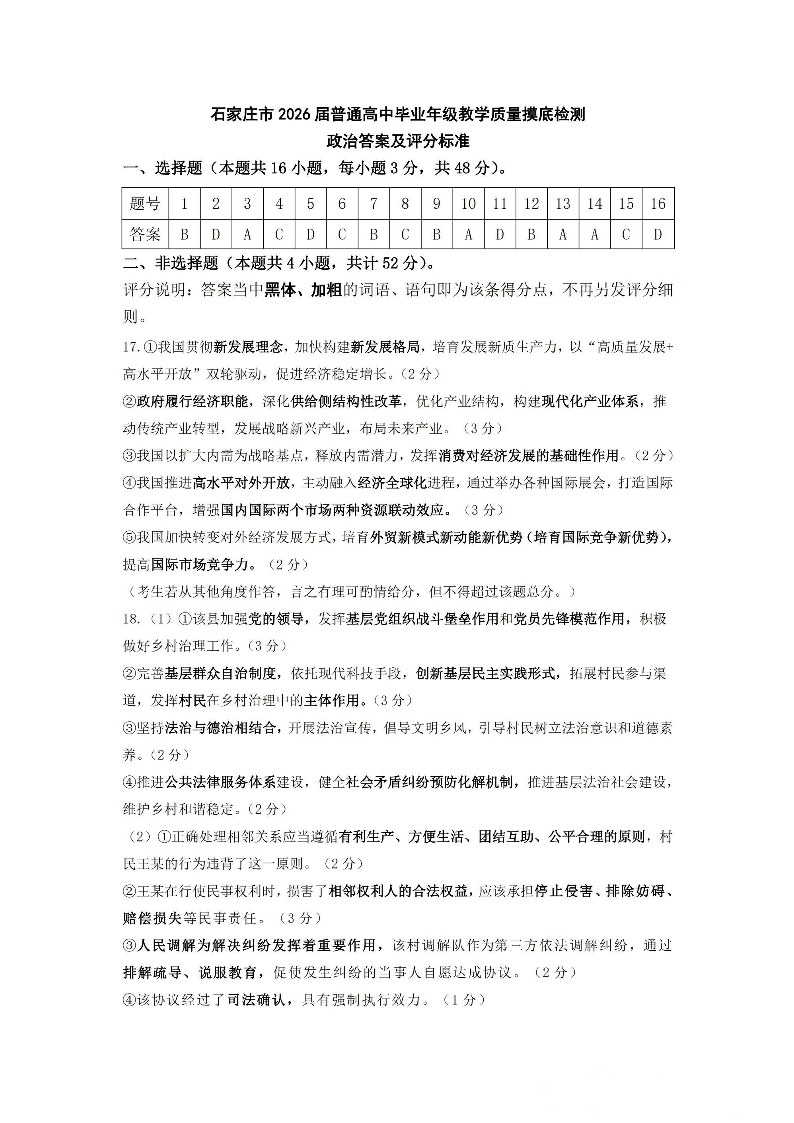 石家庄市2026届普通高中学校毕业年级教学质量摸底检测 政治答案.pdf