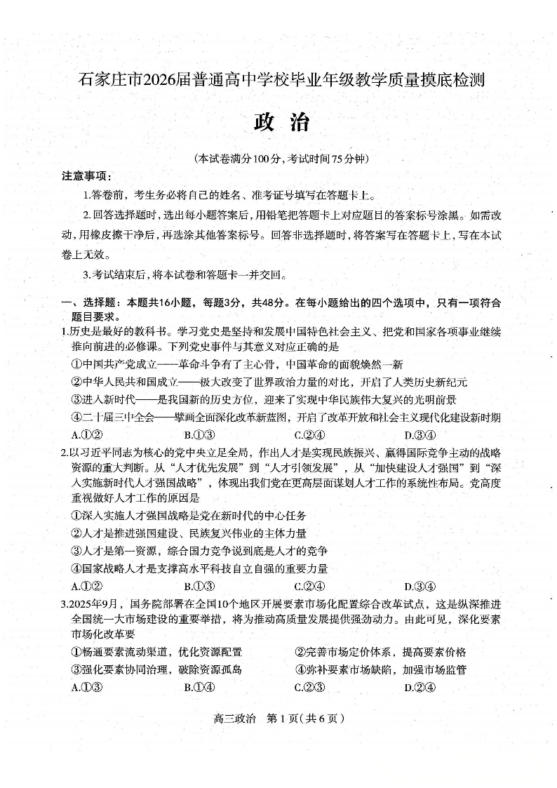 石家庄市2026届普通高中学校毕业年级教学质量摸底检测 政治.pdf
