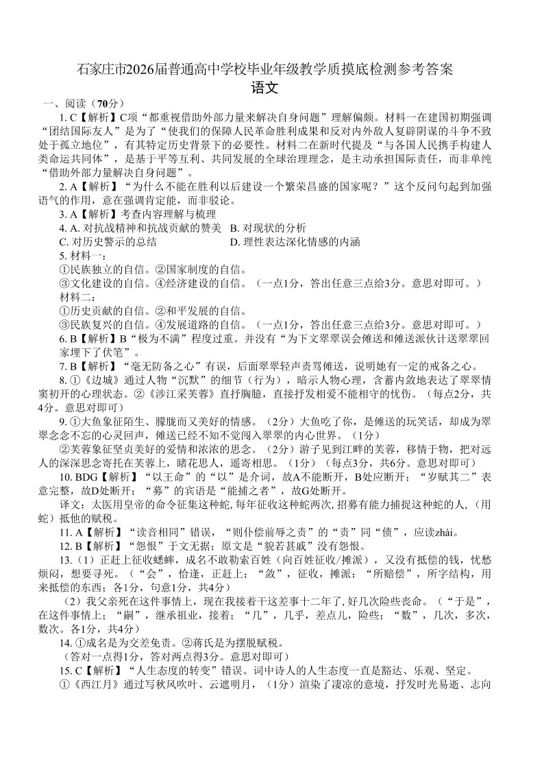 石家庄市2026届普通高中学校毕业年级教学质量摸底检测 语文答案.pdf