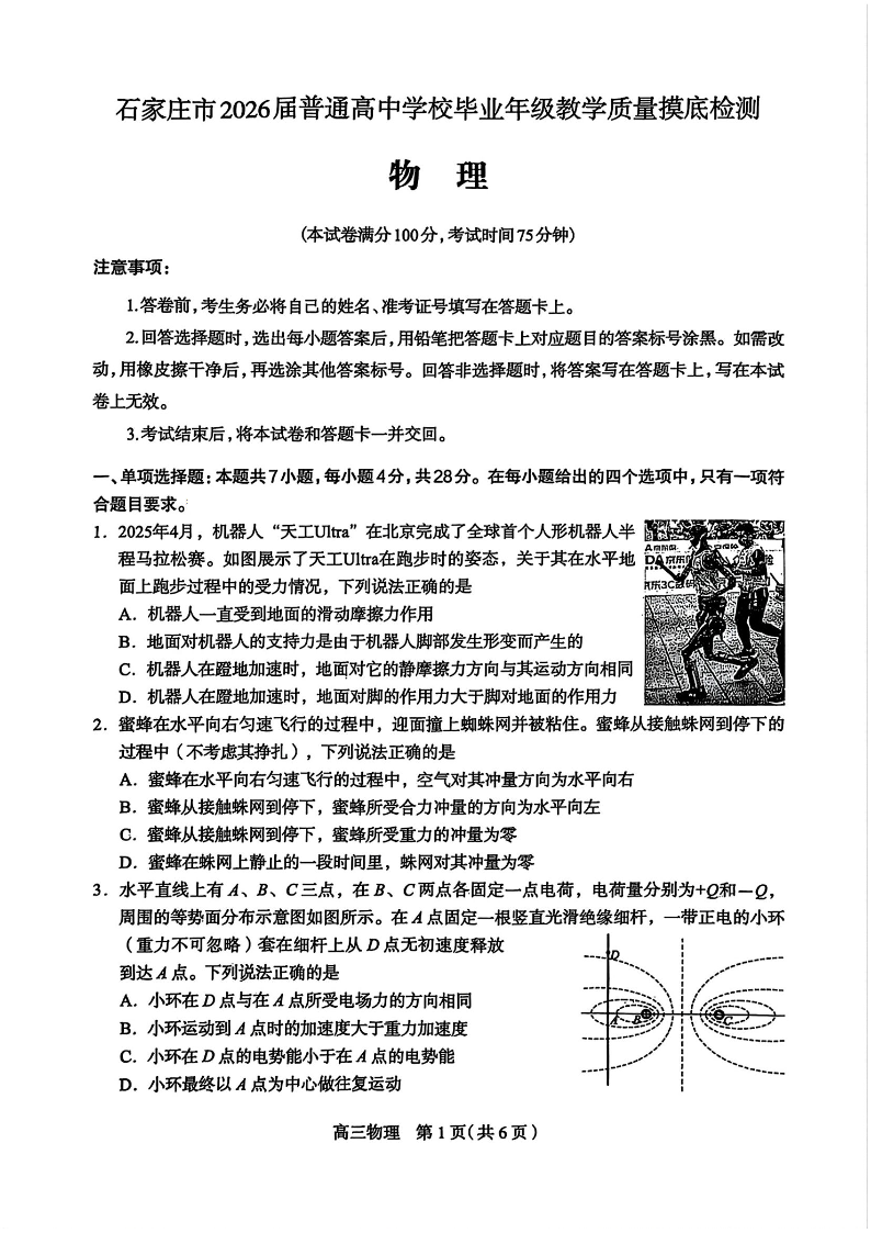 石家庄市2026届普通高中学校毕业年级教学质量摸底检测 物理.pdf