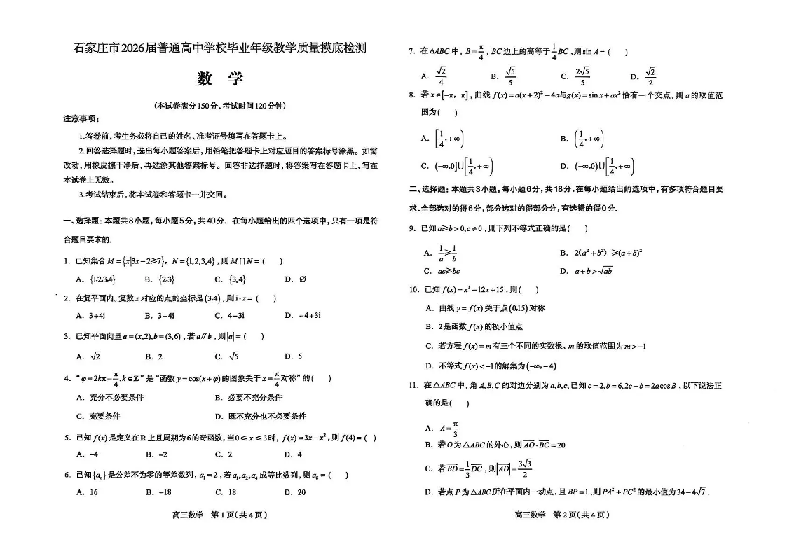 石家庄市2026届普通高中学校毕业年级教学质量摸底检测 数学.pdf