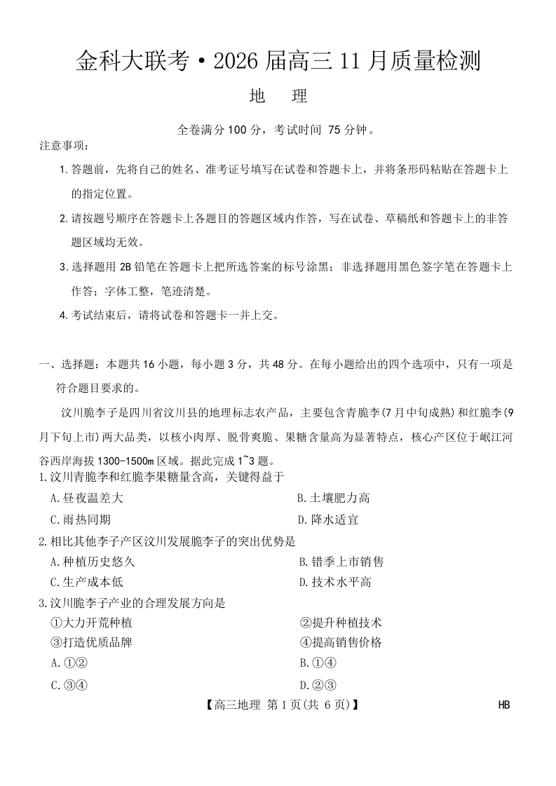 河北省金科大联考2026届高三上学期11月期中质量检测考试 地理试题(含答案).docx