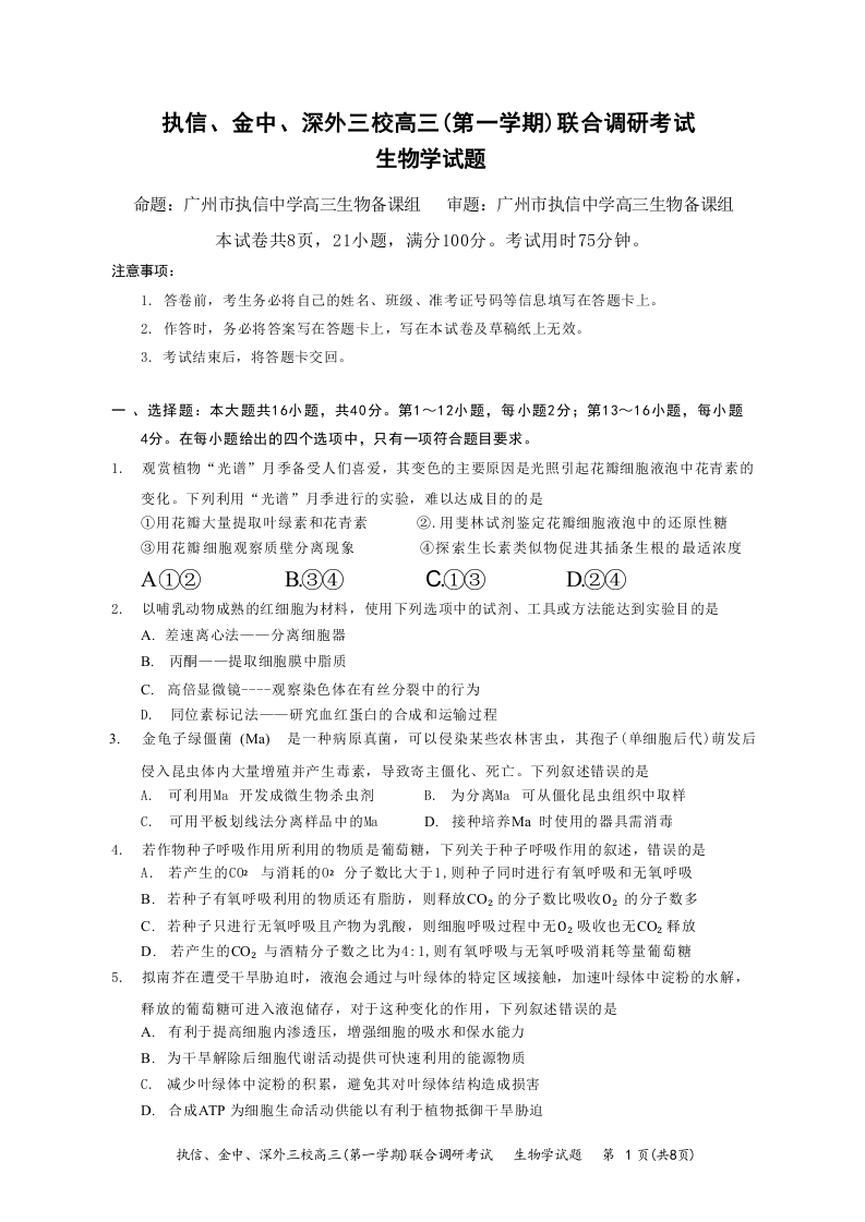 广东执信、金中、深外三校2026届高三(第一学期)11月联合调研考试 生物.docx