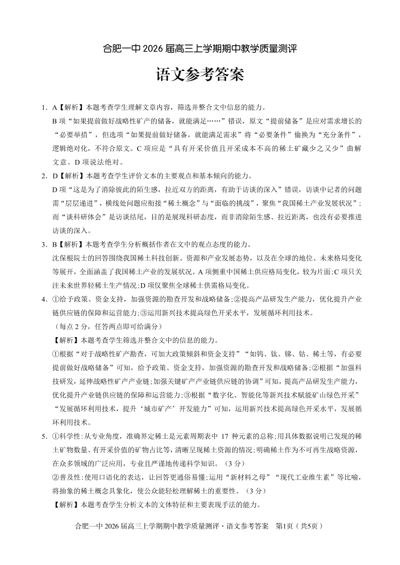 合肥一中2026届高三上学期期中教学质量检测 语文答案.pdf