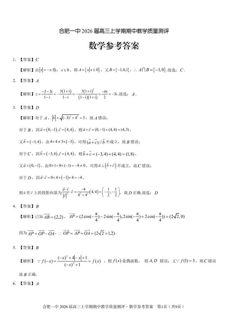 合肥一中2026届高三上学期期中教学质量检测 数学答案.pdf