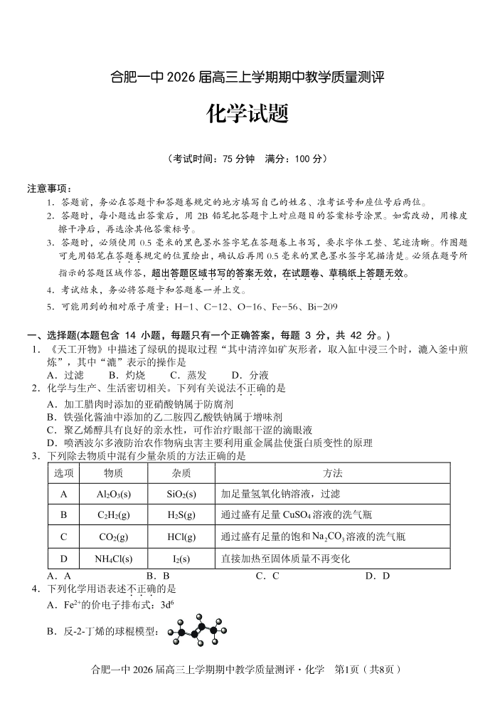 合肥一中2026届高三上学期期中教学质量检测 化学.pdf
