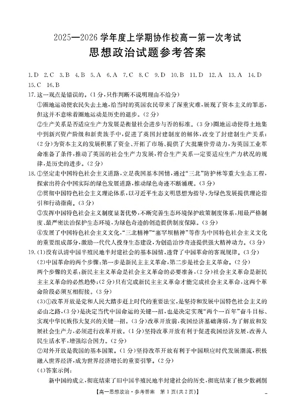 辽宁省葫芦岛市、县协作校2025-2026学年高一上学期第一次考试 政治答案.pdf