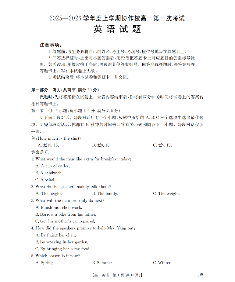 辽宁省葫芦岛市、县协作校2025-2026学年高一上学期第一次考试 英语.pdf