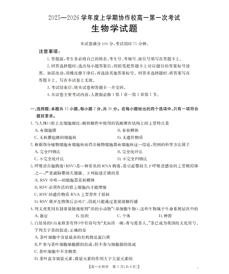 辽宁省葫芦岛市、县协作校2025-2026学年高一上学期第一次考试 生物.pdf