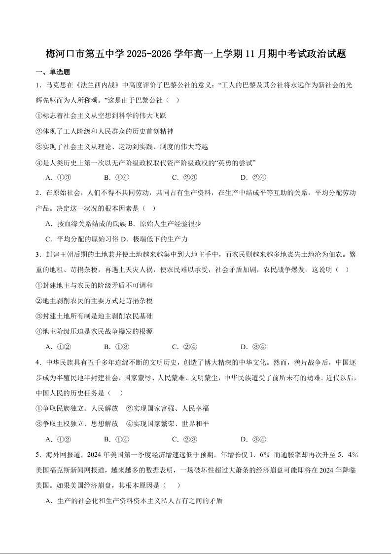 吉林省梅河口市第五中学2025-2026学年高一上学期11月期中考试 政治试题(含答案).docx