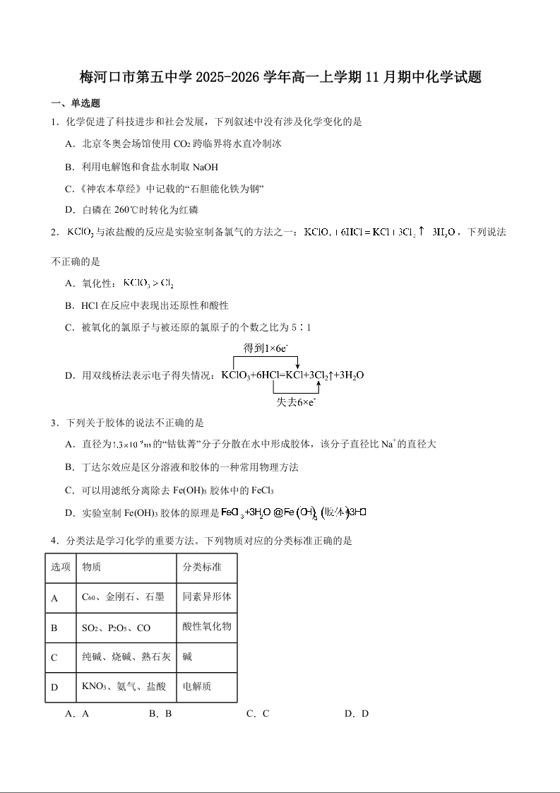 吉林省梅河口市第五中学2025-2026学年高一上学期11月期中考试 化学试题(含答案).docx
