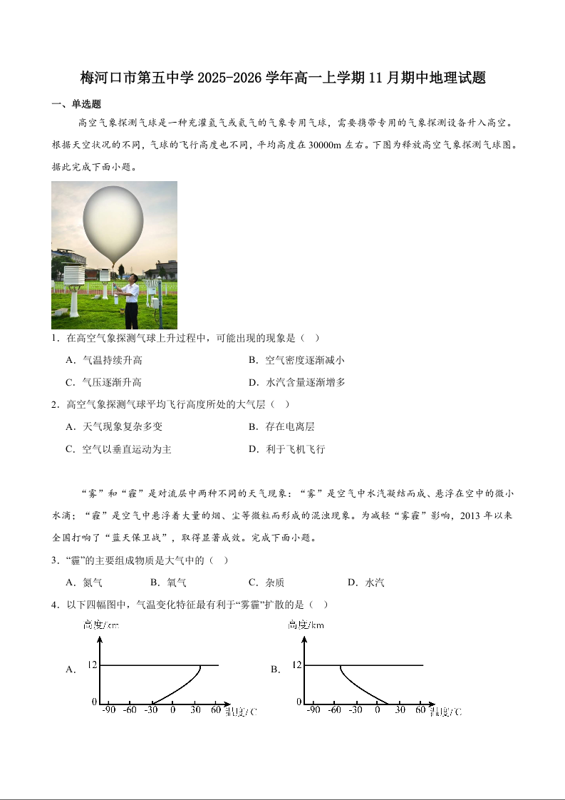 吉林省梅河口市第五中学2025-2026学年高一上学期11月期中考试 地理试题(含答案).docx