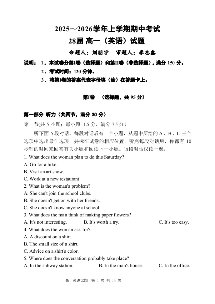 河南省郑州市第一中学2025~2026学年高一上学期期中考试 英语试题(含答案).pdf