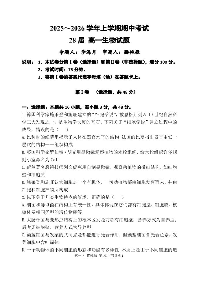 河南省郑州市第一中学2025~2026学年高一上学期期中考试 生物试题(含答案).pdf