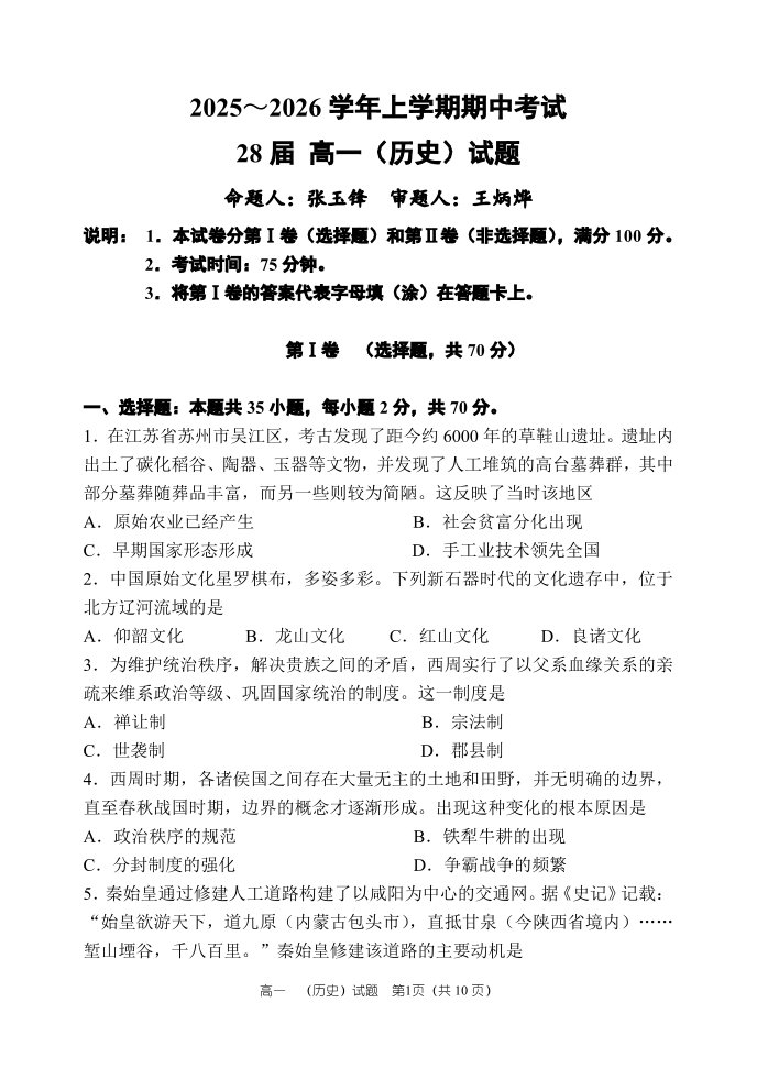 河南省郑州市第一中学2025~2026学年高一上学期期中考试 历史试题(含答案).pdf