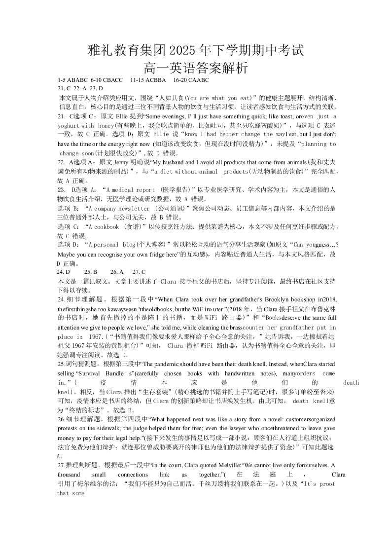 湖南省长沙市雅礼中学2025-2026学年高一上学期11月期中考试 英语答案.docx
