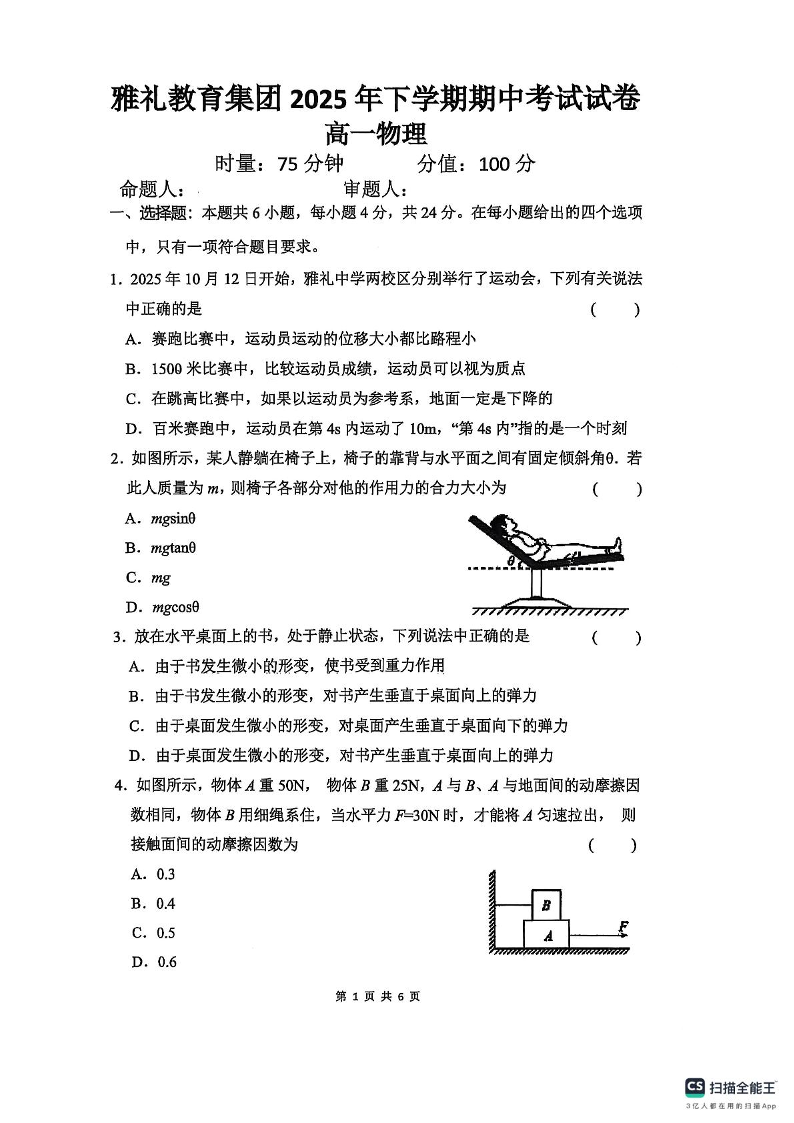湖南省长沙市雅礼中学2025-2026学年高一上学期11月期中考试 物理.pdf