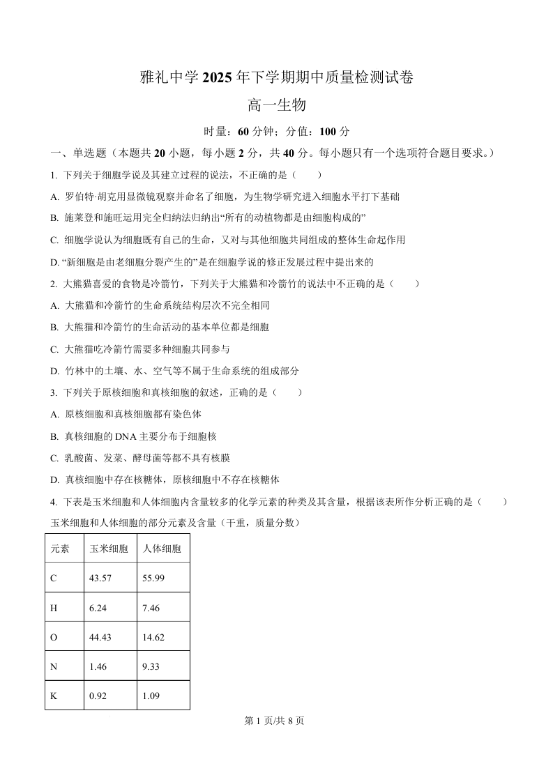 湖南省长沙市雅礼中学2025-2026学年高一上学期11月期中考试 生物.docx