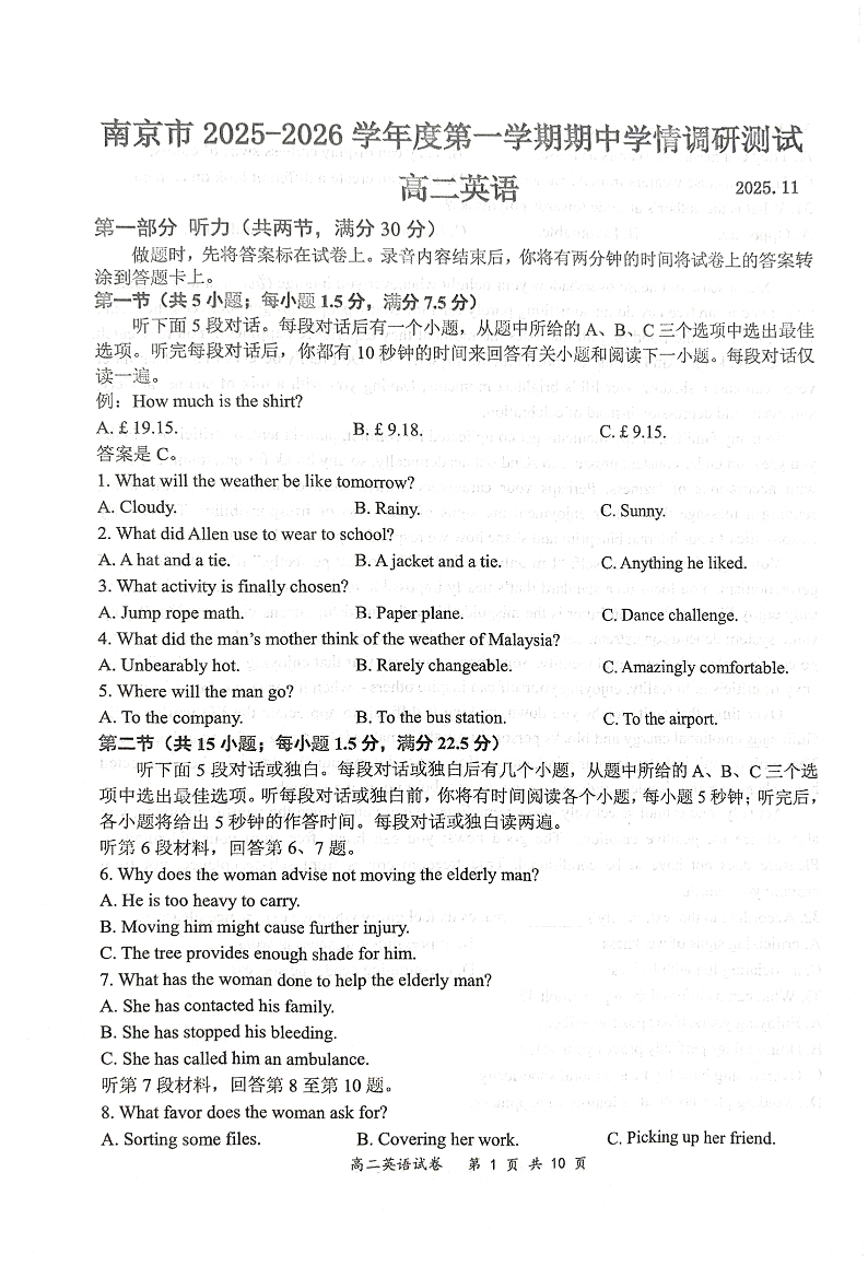 江苏省南京市2025-2026学年高二上学期期中学情调研测试 英语试题(含答案).pdf