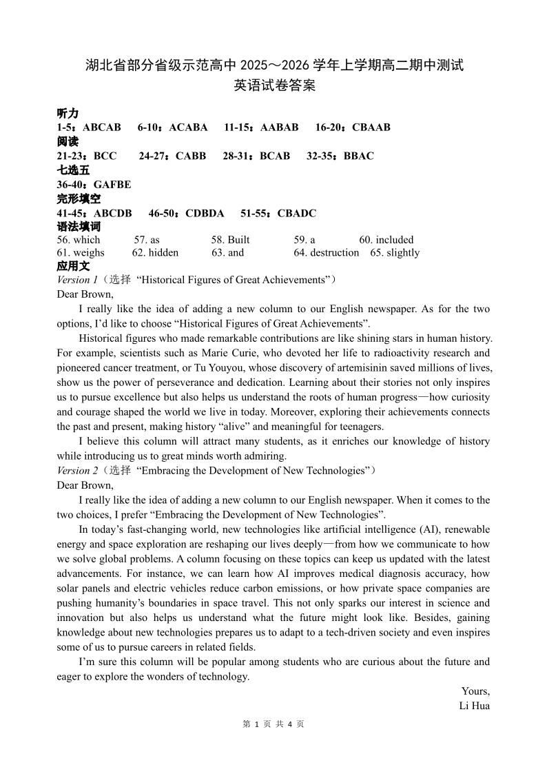 湖北省部分省级示范高中2025-2026学年高二上学期期中考试 英语答案.pdf