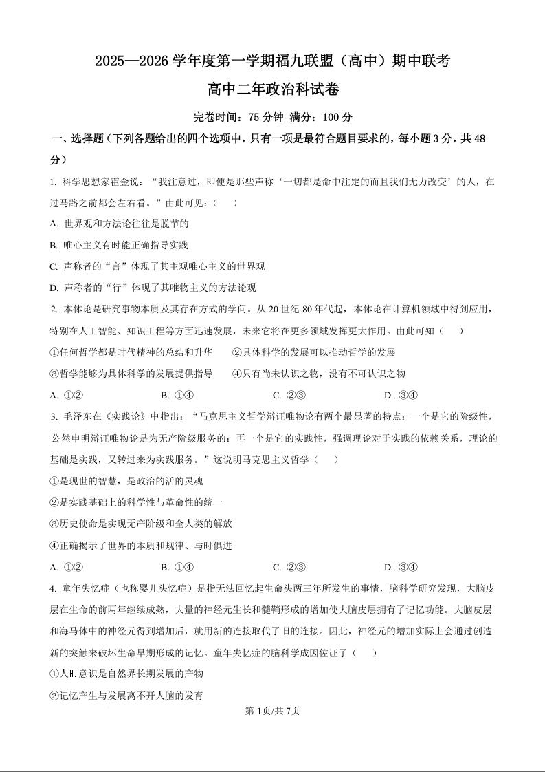 福建省福州市福九联盟2025-2026学年高二上学期11月期中考试 政治.docx