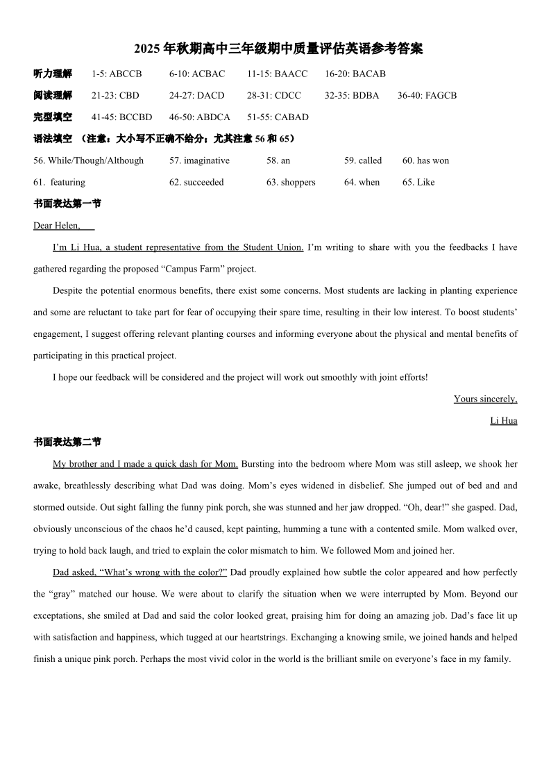 河南省南阳市2025年秋期高中三年级期中质量评估 英语答案.pdf