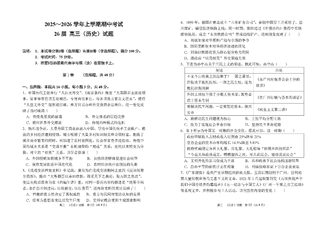 郑州市第一中学2025-2026学年高三上学期期中考试 历史.pdf