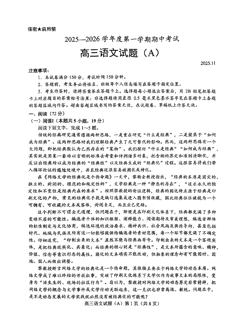 菏泽市A类高中2026届高三第一学期期中考试 语文.pdf