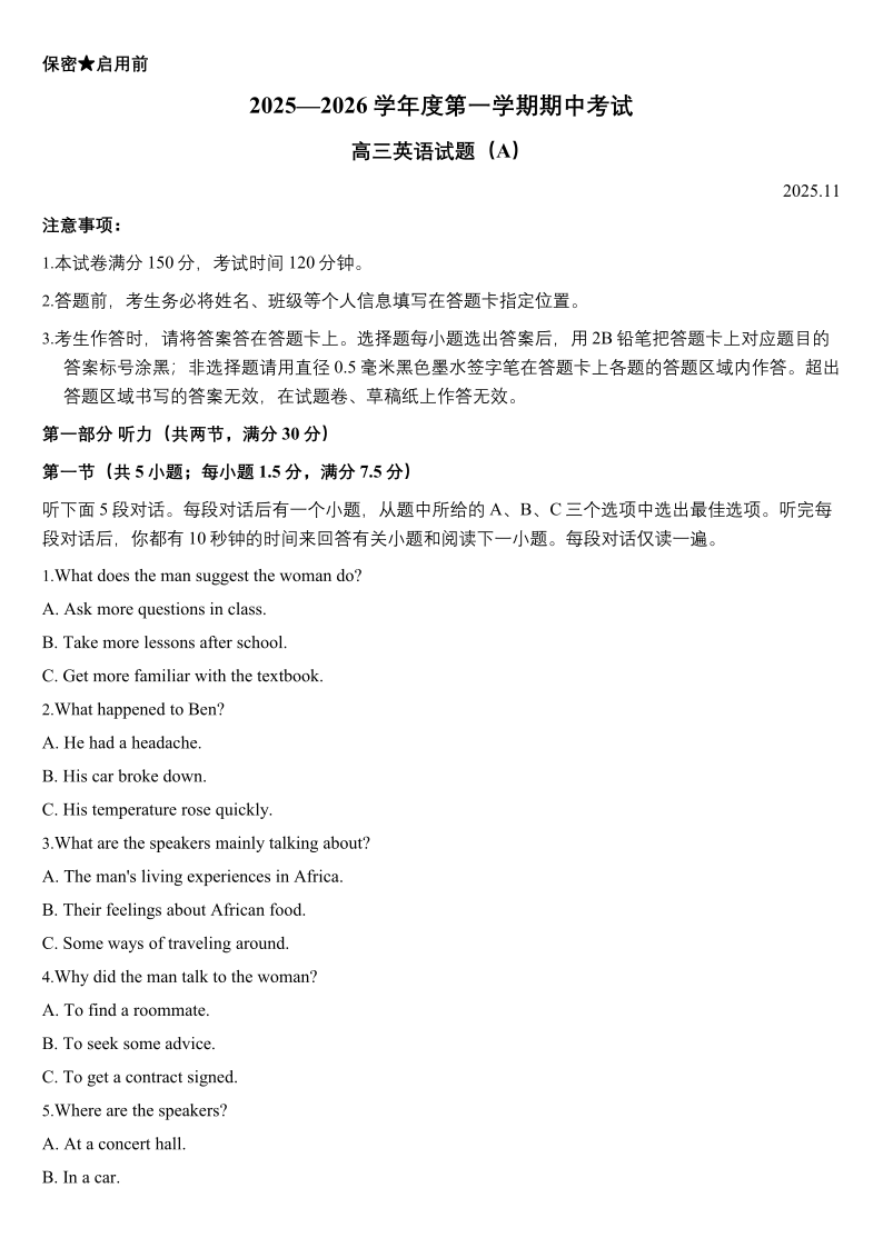 菏泽市A类高中2026届高三第一学期期中考试 英语.pdf
