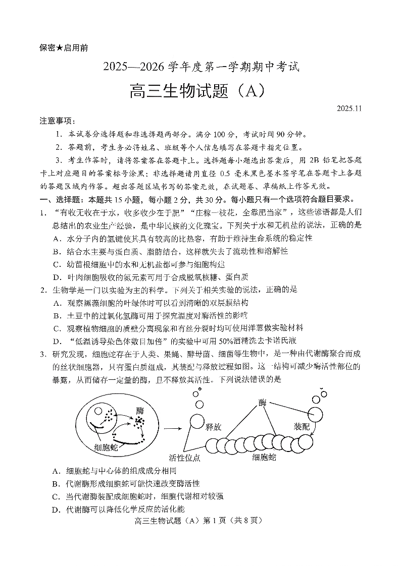菏泽市A类高中2026届高三第一学期期中考试 生物.pdf