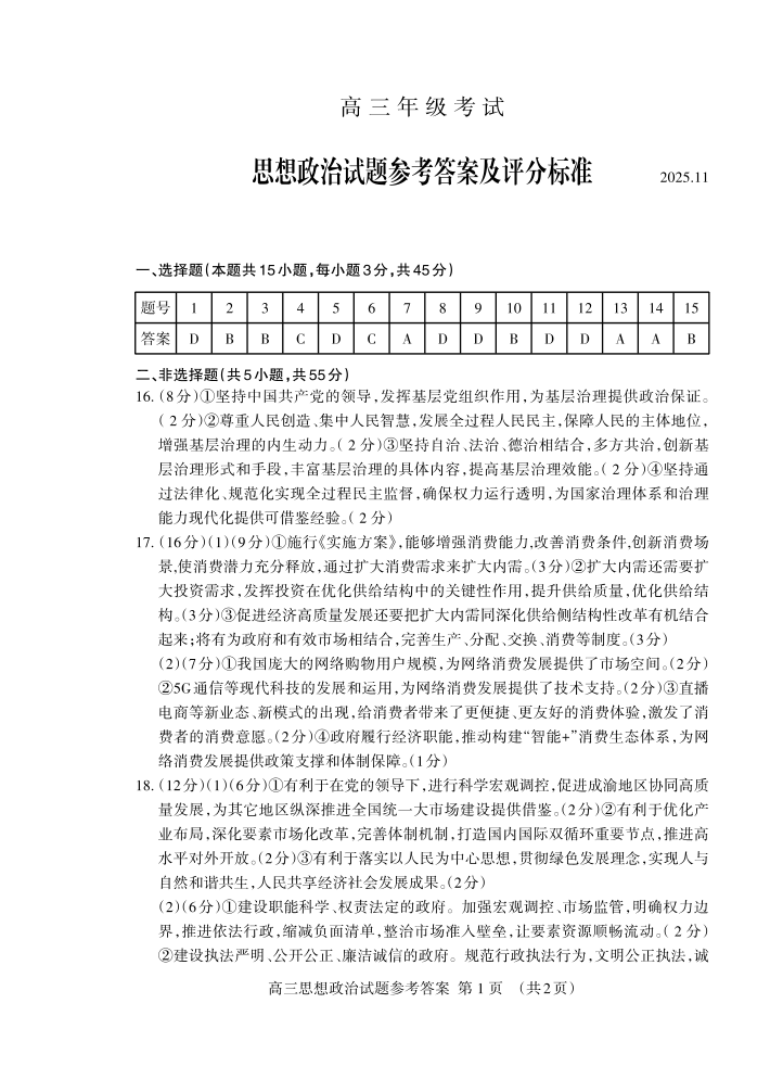 山东省泰安市2026届高三上学期期中考试 政治答案.pdf