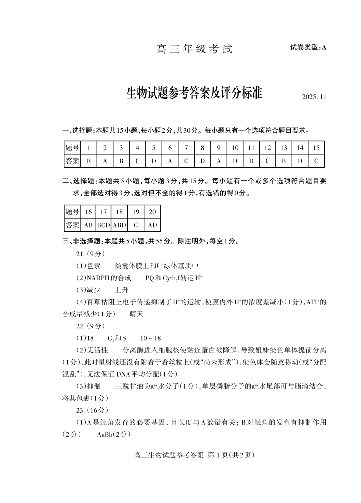 山东省泰安市2026届高三上学期期中考试 生物答案.pdf