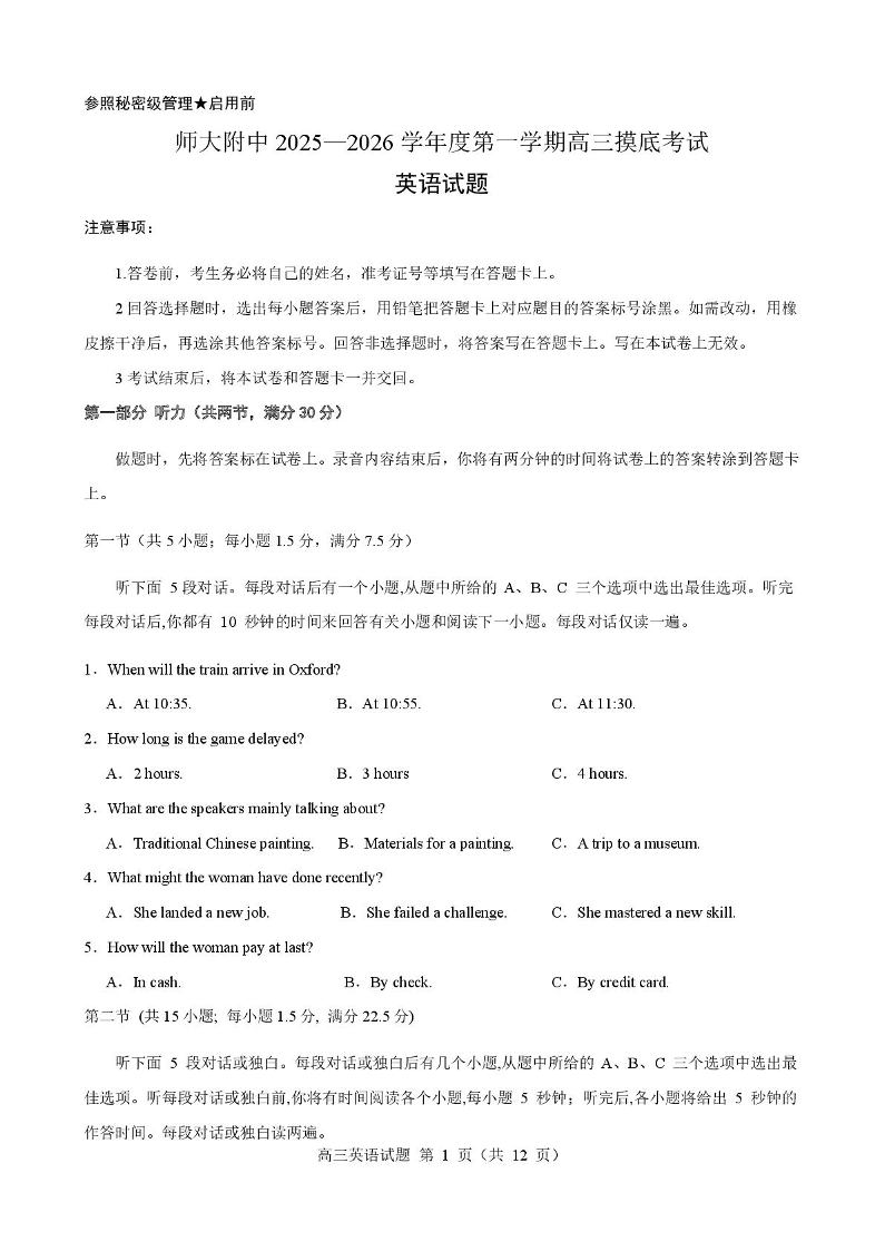 山东师大附中2025-2026学年度第一学期高三摸底考试 英语.pdf