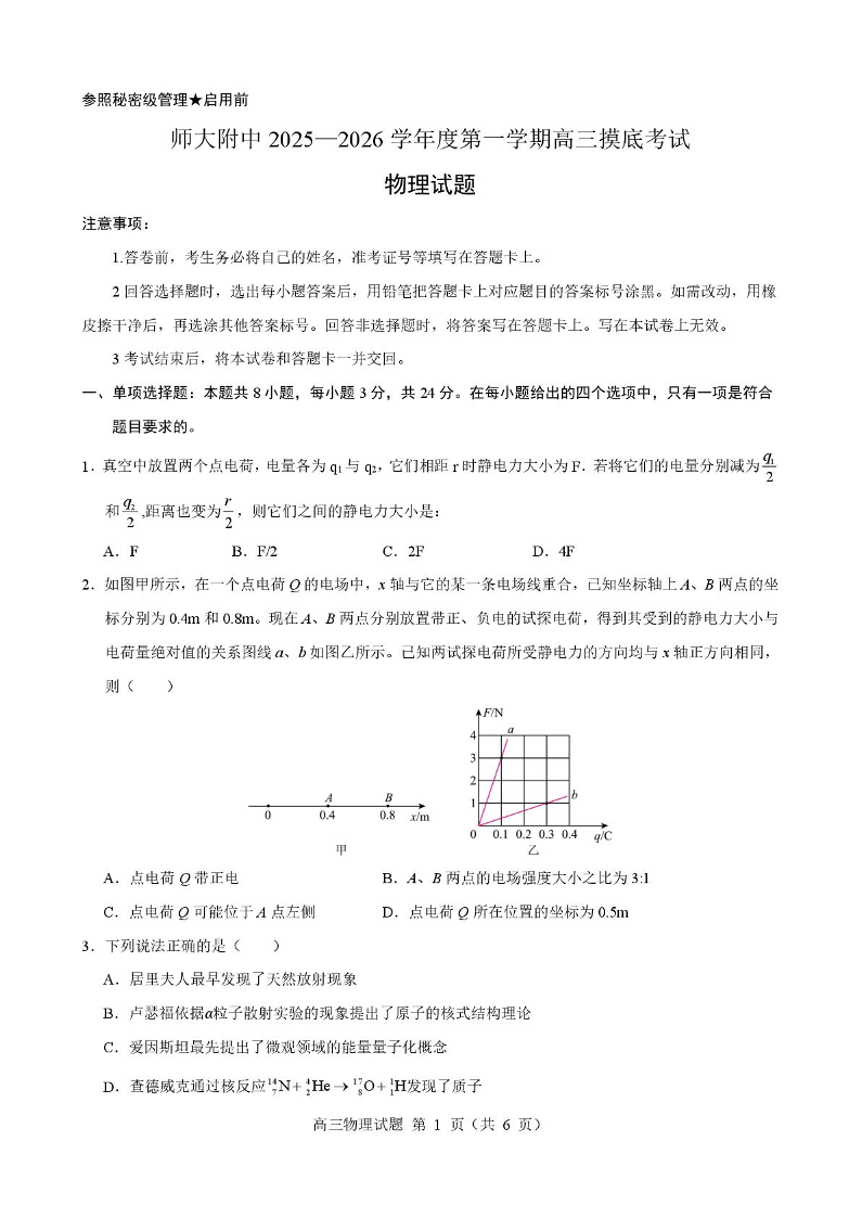 山东师大附中2025-2026学年度第一学期高三摸底考试 物理.pdf