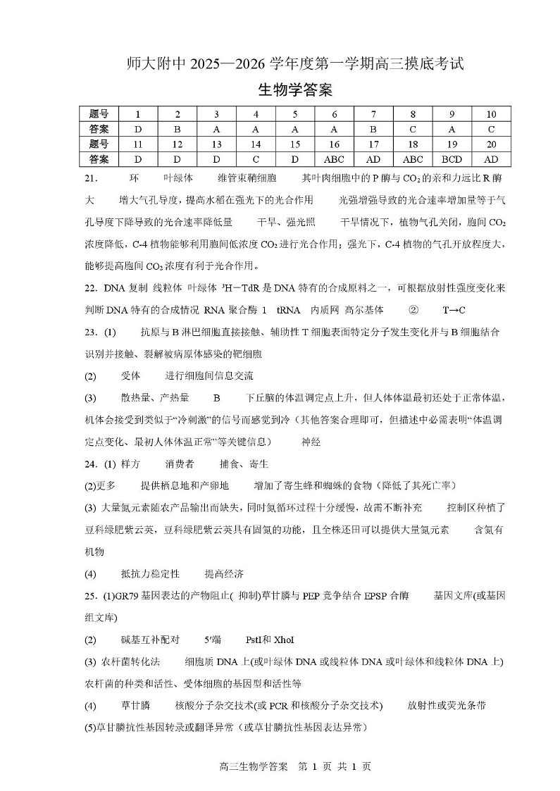 山东师大附中2025-2026学年度第一学期高三摸底考试 生物答案.pdf
