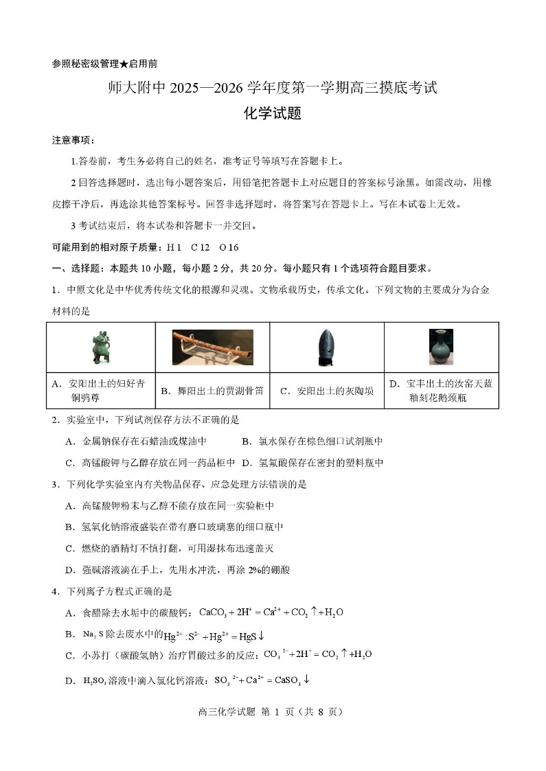 山东师大附中2025-2026学年度第一学期高三摸底考试 化学.pdf