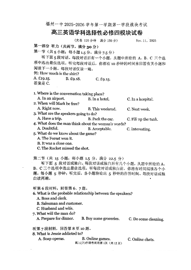 福州市第一中学2025-2026学年第一学期第一学段模块考试 英语试题(含答案).pdf