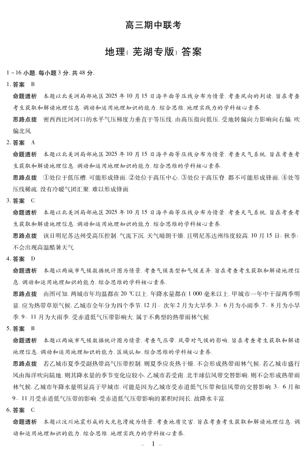 安徽省2026届高三上学期期中联考 地理(芜湖专版)答案.pdf