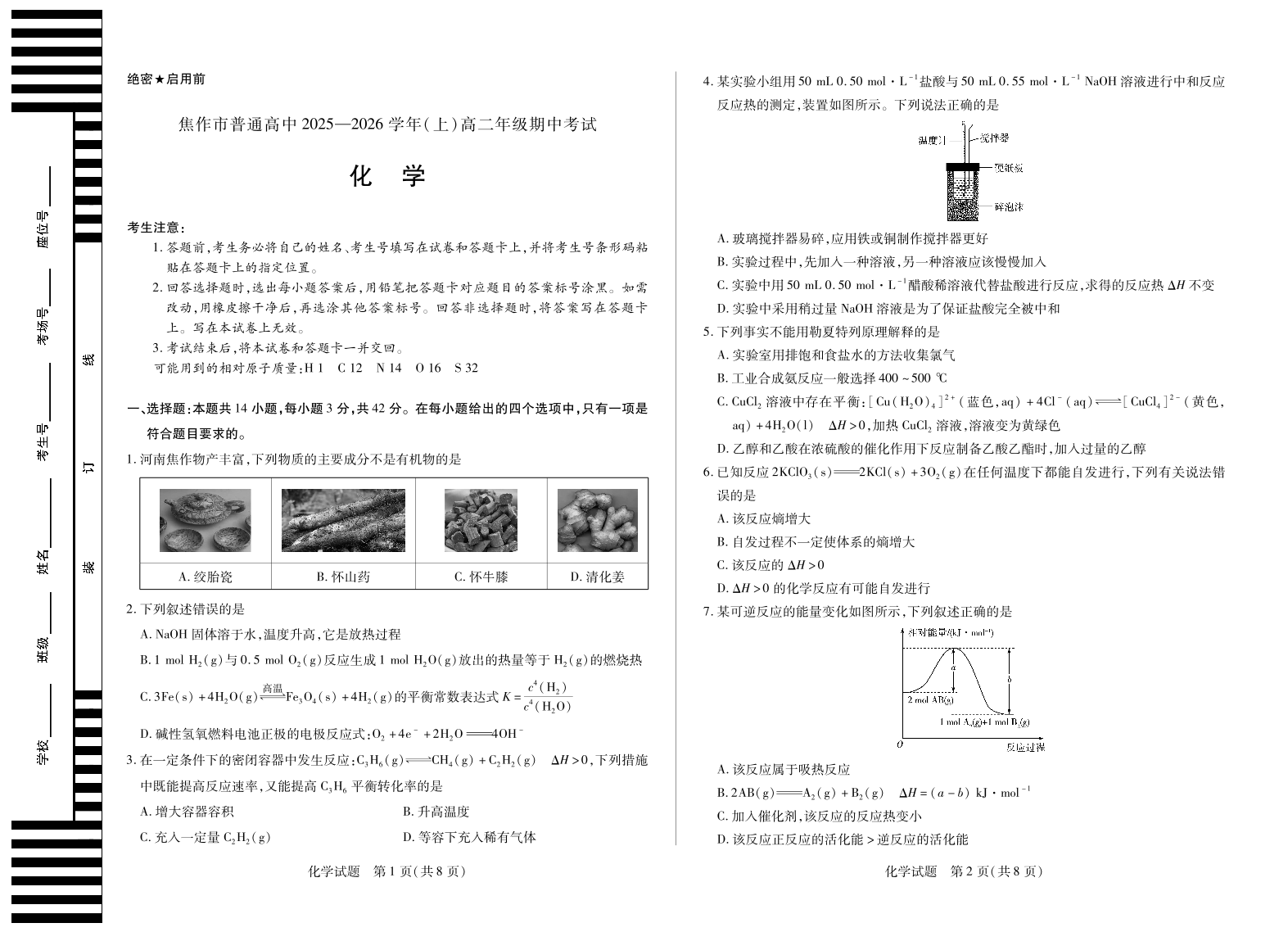 河南焦作市2025-2026学年高二上学期期中考试 化学.pdf