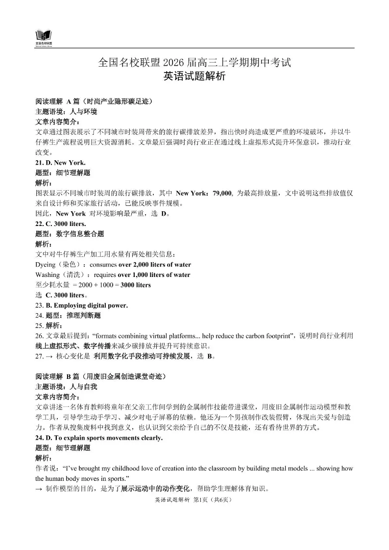 全国名校联盟2026届高三上学期期中考试 英语解析.pdf