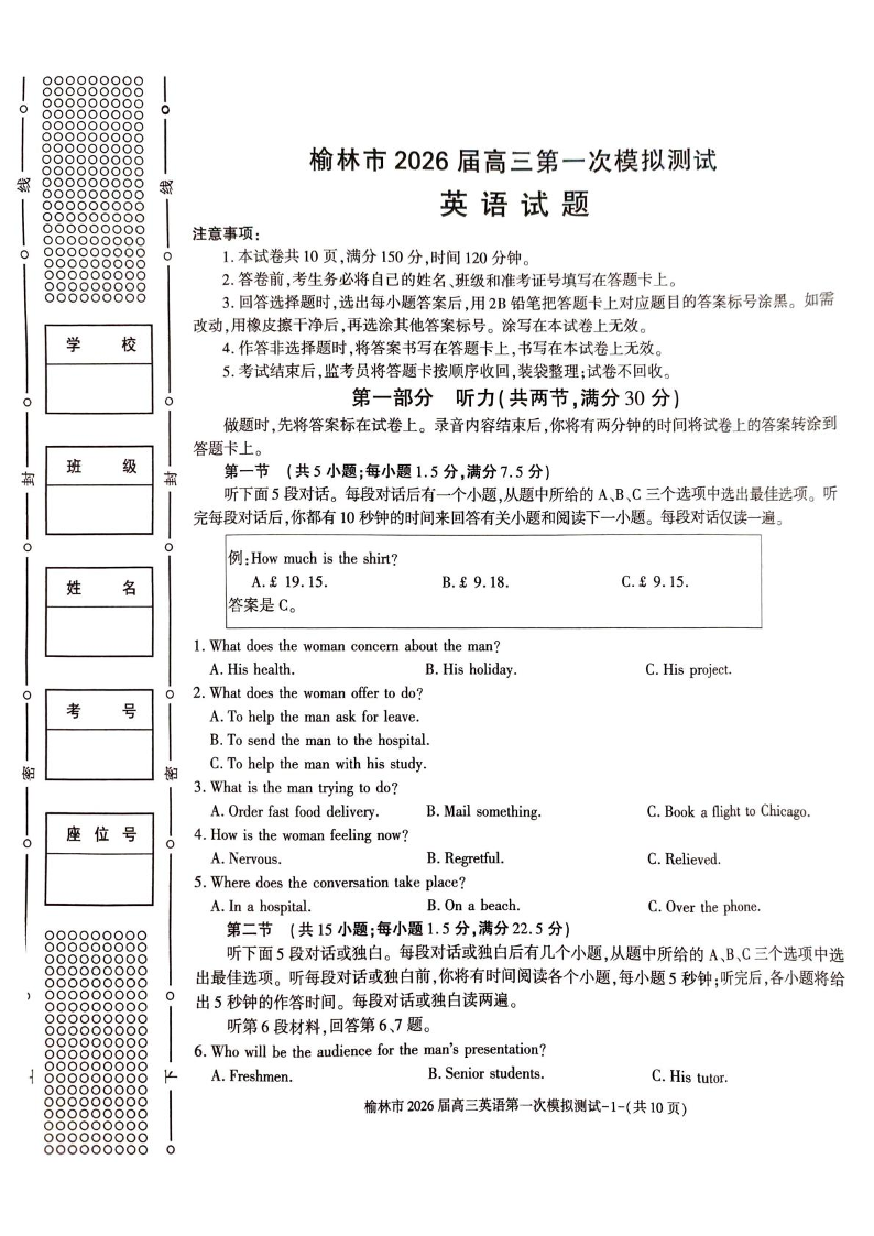 陕西省榆林市2026届高三上学期第一次模拟测试 英语试卷(含答案).pdf