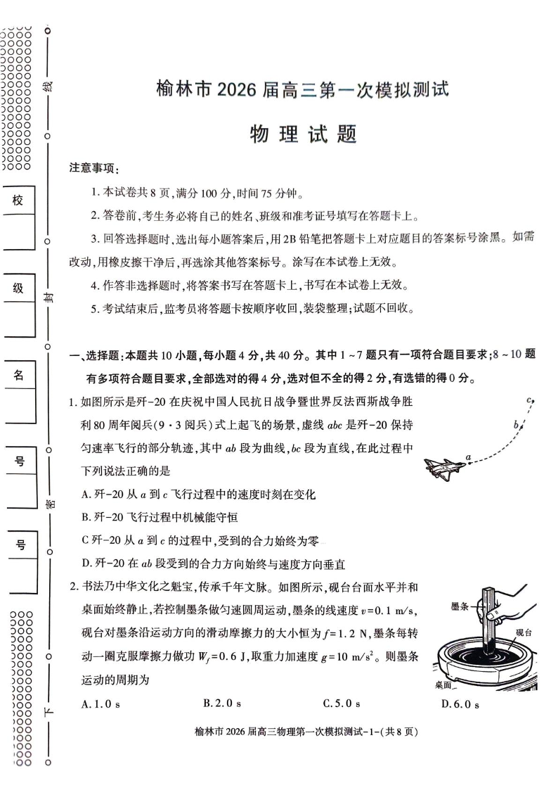陕西省榆林市2026届高三上学期第一次模拟测试 物理试卷(含答案).pdf