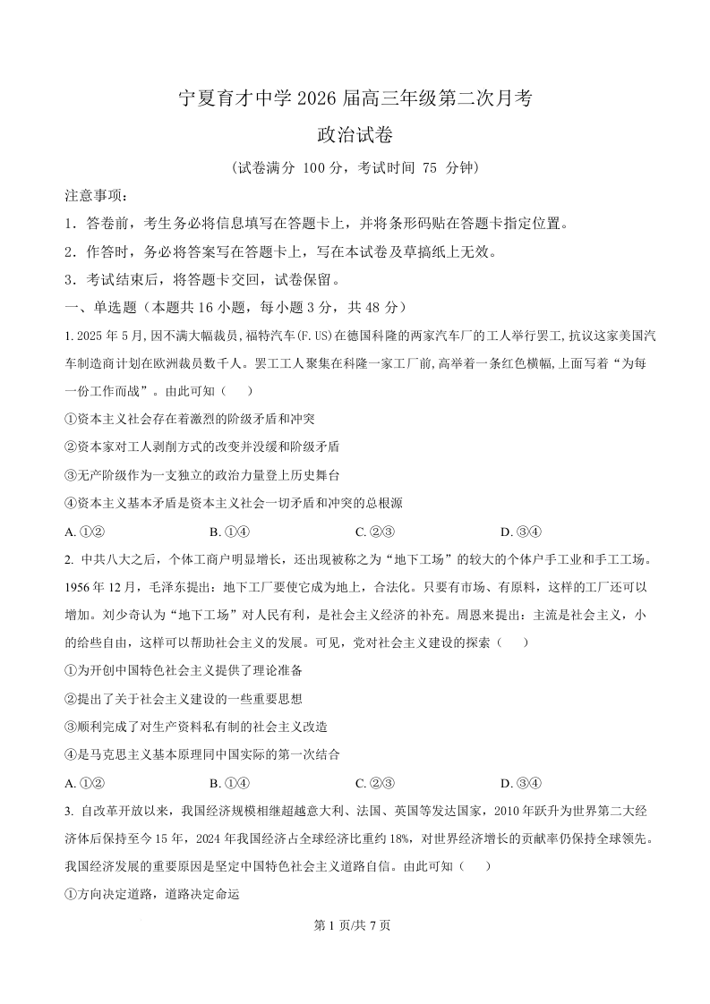 宁夏育才中学2025-2026学年高三上学期第二次月考 政治.docx