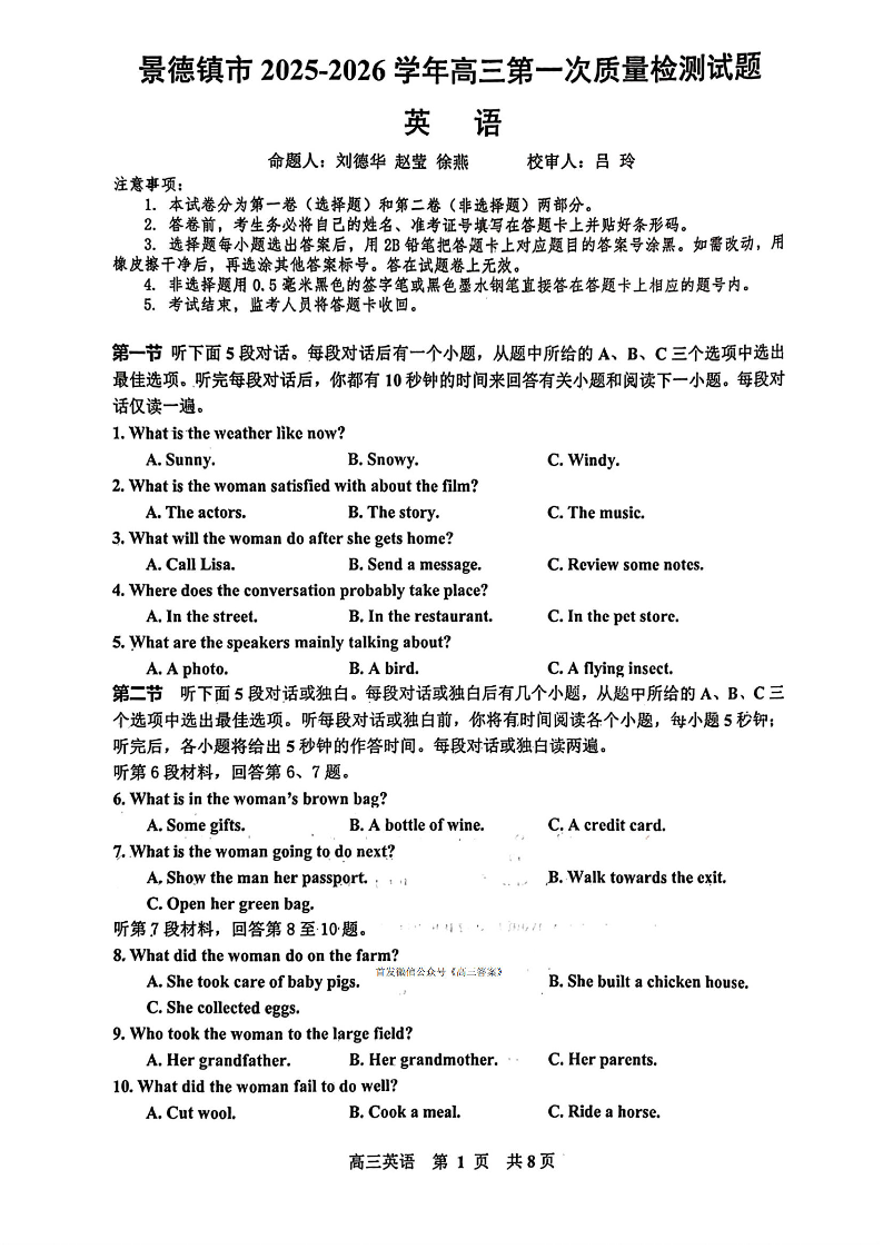 景德镇市2026届高三第一次质量检测 英语.pdf