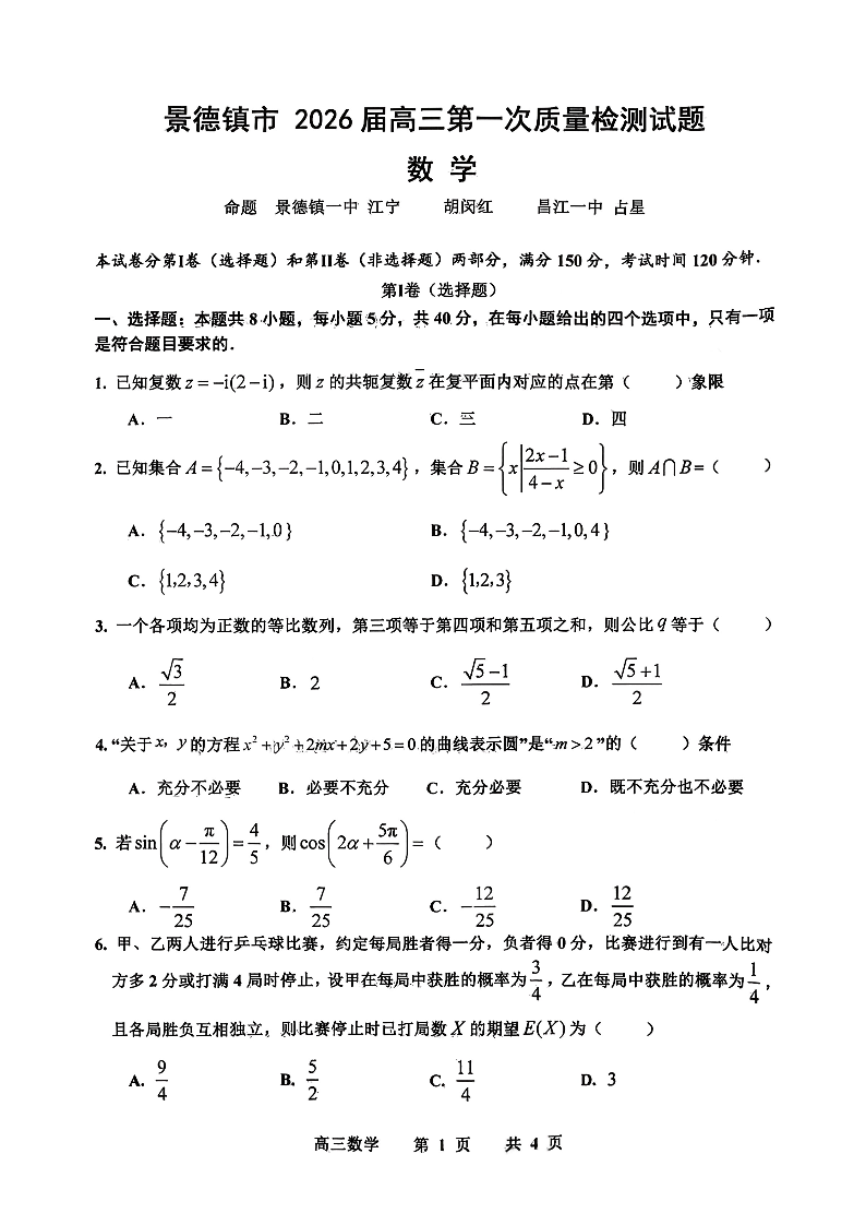 景德镇市2026届高三第一次质量检测 数学.pdf