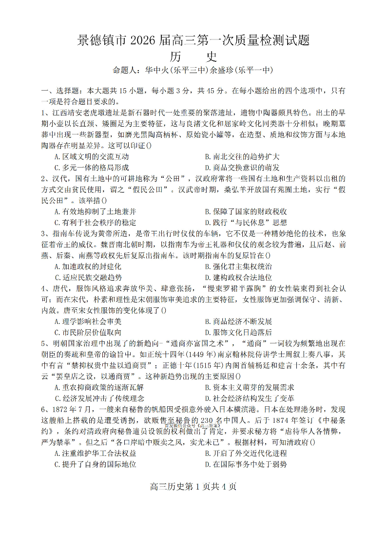 景德镇市2026届高三第一次质量检测 历史.pdf