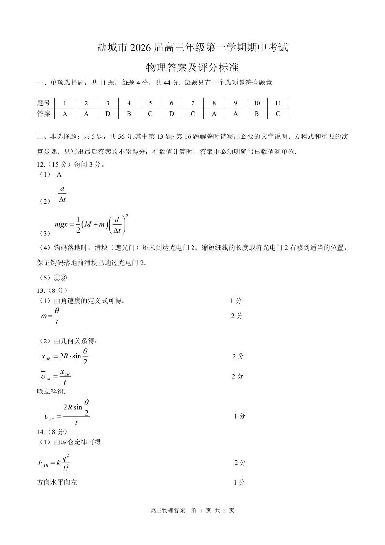 盐城市2026届高三年级第一学期期中考试 物理答案.pdf
